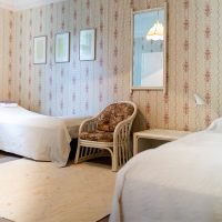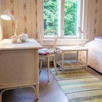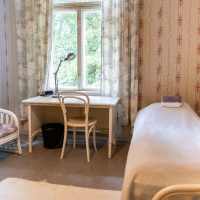 There are two Residency rooms, Aleksis and Eino. Both rooms have a bed suitable for one (Eino) or two (Aleksis) persons, a writing desk and a chair. The furniture is basic. Linen and towels are included. There is a shared kitchen and a bathroom/toilet. The kitchen is equipped with e.g. fridge, filter coffee machine, an electric hot water pot, a toaster, a micro-wave oven and common utensils for cooking and eating. Residency guests have also access to a washing machine and a bicycle.